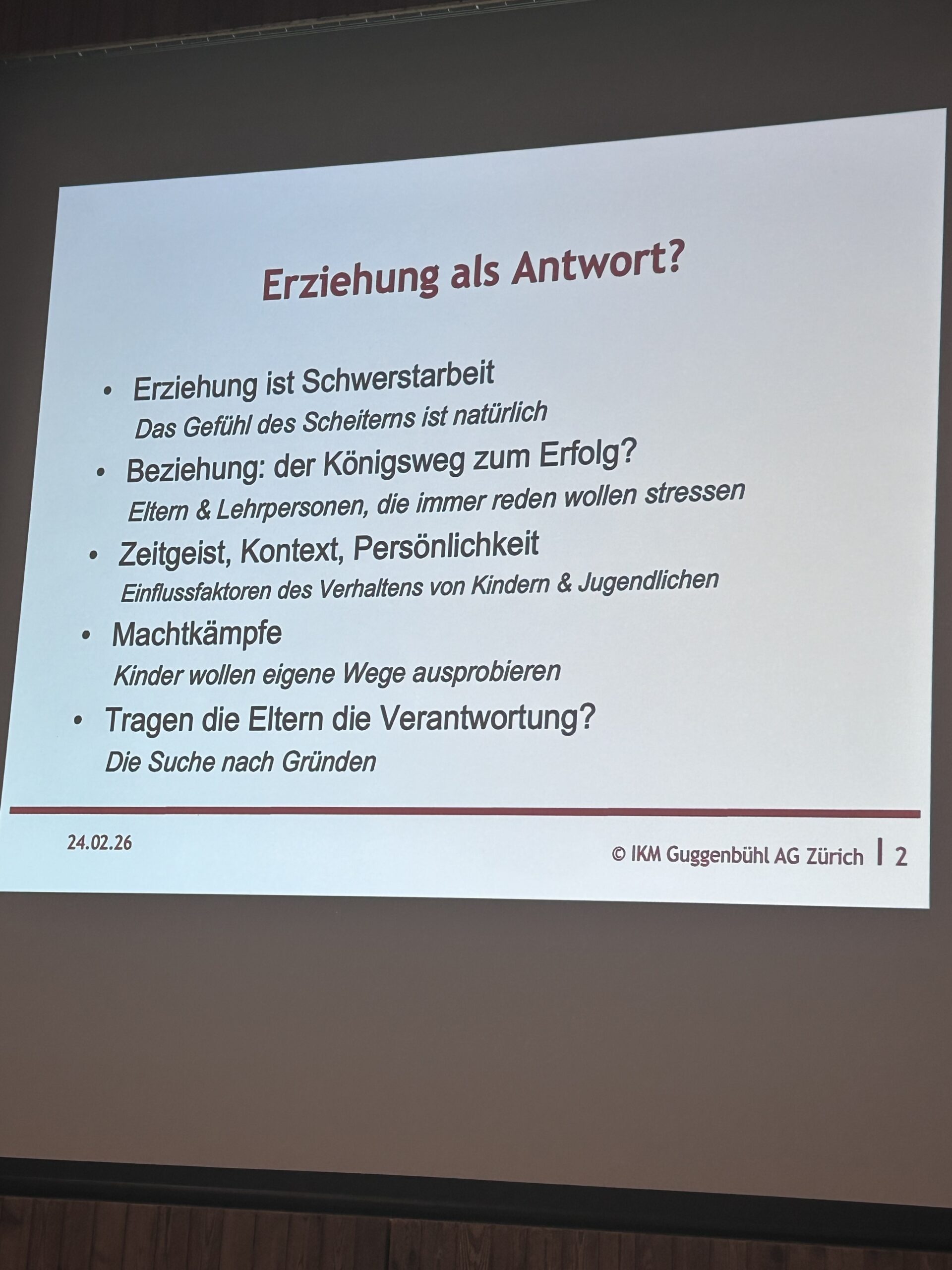Erziehung ist Schwerstarbeit, stellte Allan Guggenbühl und mit ihm wohl auch die Eltern und Lehrerinnen und Lehrer im Raum fest. Kinder, so erklärte Allan Guggenbühl weiter, brauchen Erwachsene, die Werte vertreten und sich gleichzeitig bewusst sind, dass die Kinder ihren eigenen Weg suchen und möglicherweise nicht bereit sind, ihre Werte zu übernehmen.