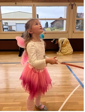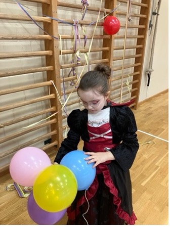 Nachdem alles schön geschmückt war, trafen wir uns zum Tanzen. Zu fetziger Musik bewegten sich Prinzessinnen, Piraten, Superhelden und viele andere Figuren durcheinander. Besonders viel Spass machten auch die Ballonspiele. Es wurde viel gelacht.